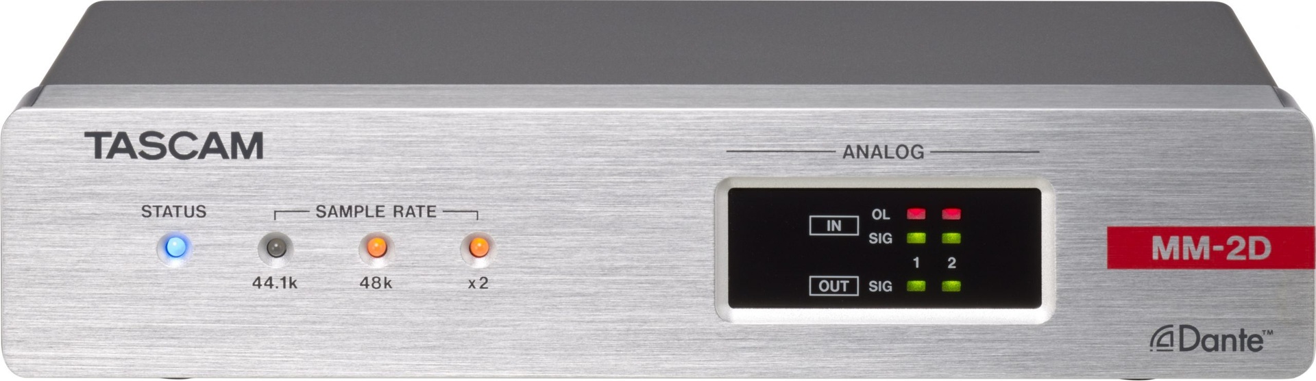 The MM-2D-X is a compact converter that converts 2-channel mic/line input/output signals into Dante signals. With half the size of a standard 1U rack, the MM-2D-X is suitable for different Dante systems as an exquisite analog output unit. The built-in DSP mixer enables small scale systems to fully perform with a variety of input/output models the TASCAM Dante Compact Processor Series offers. MM-2D-X supports up to 96kHz/24bit and uses XLR connectors for analog mic/line input/output.
