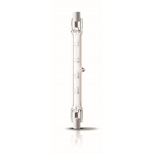 Double-ended bulb runs from mains voltage and features a coiled-coil filament, giving a bright white halogen light
