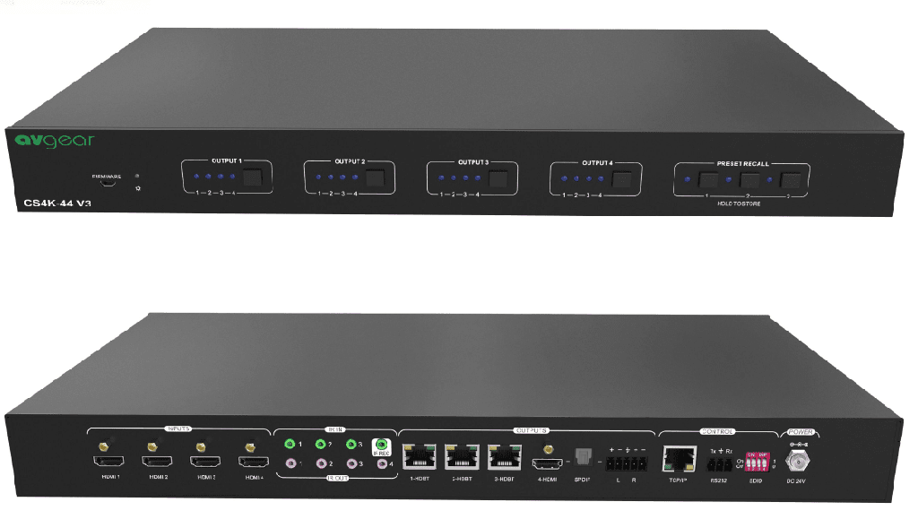 This 4K 4×4 HDBaseT Matrix with 3 Receivers. It features 4 HDMI inputs, 1 HDMI output with audio breakout and 3 HDBaseT outputs. The de-embedded audio can be output from SPDIF and L/R connector.