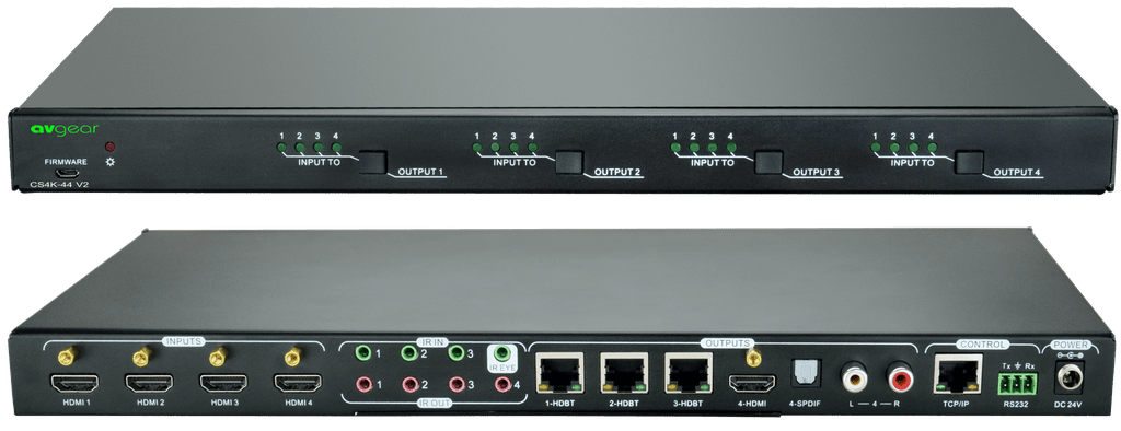 This product is a professional 4K HDBaseT Home Distribution Matrix Kit, which consists of a 4K HDBaseT Matrix Switcher, 3 HDBaseT Receivers and all accessories required for a standalone system. This system is also capable of being fully integrated into a whole home control system solution. Features Supports HDMI 1.4 & HDCP 2.2, is compliant with lower standards. Supports manual HDCP management and auto-detection Transmits 4Kx2K signal for 8m via HDMI port, 40m via HDBT ports 3 HDBaseT outputs, distances up to 70m at 1080p and 40m at 4Kx2K on a single CAT6 The HDBaseT Receivers are powered by the matrix switcher, 12VDC via PoC technology LED indicators show real-time switching status. Control via front panel, RS232, IR and TCP/IP Supports bi-directional IR & RS232 control Built-in GUI for TCP/IP control Powerful EDID management Video Input Input 4 HDMI Input Connector Female HDMI Input Level T.M.D.S. 2.9V~3.3V Input Impedance 100Ω (Differential) HDMI Standard Supports HDMI 1.4 & HDCP 2.2 and is backwards compatible with all previous standards. Video Output Output 1 HDMI – 3 HDbaseT Output Connector Female HDMI; Female RJ45(with LED indicators) Output Level T.M.D.S. 2.9V~3.3V Output Impedance 100Ω (Differential) HDMI Standard Supports HDMI 1.4 & HDCP 1.4 and is backwards compatible with all previous standards. Video general Video Signal HDMI (or DVI-D) Transmission Distance 1080P@60Hz ≤70m; 4Kx2K@60Hz ≤40m Resolution Range Up to 4Kx2K@60Hz EDID Management In-built EDID data and manual EDID management Gain 0 dB Bandwidth 10.2Gbit/s Switching Speed 200ns (Max.) Audio general Output Signal Stereo audio; Digital audio Analog Audio Output Supports PCM Digital Audio Output Supports PCM,Dolby,DTS,DTS-HD Frequency Response 20Hz~20KHz Output Connector 1 L&R(RCA); 1 SPDIF Control Control Ports 4 IR OUT; 3 IR IN ; 1 IR CONTROL; 1 TCP/IP (female RJ45); 1 RS232 (3-pin pluggable terminal block) Panel Control Front panel buttons RS232 Control 3-pin pluggable terminal block IR Extended IR receiver TCP/IP Control Web-based GUI General Power Supply Input: 100-240V~, 50/60Hz; Output: DC 24V 2.71A Power Consumption 35W (Max) Temperature 0~ +50℃ Relative Humidity 10% ~ 90% Dimension (W*H*D) 436.4mm x 44.0mm x 150.0 mm Net weight 910g