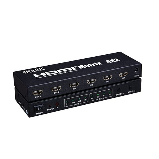 The HDM0402 4×2 HDMI matrix allows four HDMI devices to be switched orsplit easily to two HDMI compatible TVs or projectors. Supports HDMI 1.4b Supports 3D video format Supports highest resolution up to 4096*2160/30Hz Supports 3.2G data rate and tmds clock up to 320Mhz Supports 3.5 mm audio output and optical output Need DC5V/3A power supply