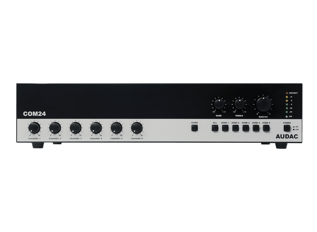 The COM series public address mixing amplifiers are providing an ideal solution for small to medium size commercial sound systems. Different configurations in terms of output power and connectivity provide enormous flexibility for numerous applications. The COM24 is capable of delivering an output power of 240 Watt to 100 Volt constant voltage systems or 4 Ohm low impedance loads. Six input channels with individual level control allow connectivity and mixing to a wide variation of music sources. Four balanced microphone inputs (XLR)containing phantom power (15V) and two priority allow connection for almost any (dynamic or condenser)microphone. Two inputs selectable between stereo unbalanced line (RCA) and microphone (6.3mm Jack) allow connection for any source such as CD-player, music computer or portable device, or enable to expand the total microphone count to 6. The remote microphone and tele-paging inputs allow expansion of the system with a paging station(with chime tones) or couple the system with your business telecom system (or any other priority line source). Using the priority mute contact, coupling and muting can be done through an external fire alarm system. The output level can be adjusted using a master volume control accompanied with 2-band tone regulation. The level is indicated with a 5-segment VU-barwhile output selection is made possible using an integrated 5-zone speaker switcher. Both table-top installation or 19” (2HE) equipment rack mounting is made possible using the included adapters.