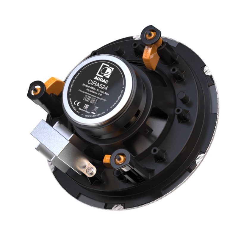 The CIRA5 features a 5 ¼” driver using polypropylene cone material, combined with a 1” Mylar tweeter fitted with a phase plug for excellent off axis performance. The selected materials guarantee a low distortion performance with smooth and flat frequency response. A continuous power handling of 30 Watt (RMS) and maximum power handling of 60 watt is achieved, while fitted with a multi-tapping 100V line transformer with tappings for 24W, 12W, 6W, 3W, 1.5W and an 16 Ohm bypass connection.
