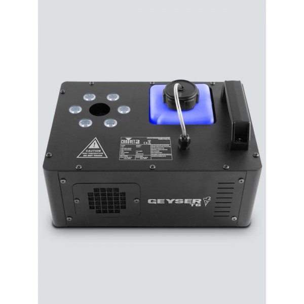 Geyser T6 brings a burst of lighting energy to your events with a pyrotechnic-like effect. Geyser T6 illuminates bursts of water-based fog with 6 tri-colour (RGB) LEDs. Its advanced fluid sensor with automatic shut off protects the pump from overheating.Compact and lightweight, Geyser T6 is perfect for mobile applications. FEATURES Pyrotechnic-like effect without the use of any toxic chemicals, fire or heavy CO2 canisters Multiple control options include wireless remote, timer remote or push button on rear Assign different colors to each of the remote’s buttons and the manual button Lightweight and compact size makes it perfect for mobile applications Digital display allows for easy configuration even in a fast paced environment Advanced fluid sensor, with automatic shut-off protects the pump from overheating LED-illuminated tank clearly shows remaining fluid level SPECIFICATIONS Light Source: 6 LEDs (tri-color RGB) 3 W (332 mA ), 50,000 hours life expectancy Illuminance: 1,783 lux @ 2 m Heat-Up Time: 1.5 min Input Voltage: 120 VAC, 60 Hz Power and Current: 830 W, 6.9 A @ 120 V, 60 Hz Weight: 7 lb (3.2 kg) Size: 12 x 8.25 x 7 in (304.8 x 209.55 x 177.8 mm) Approvals: CE, FCC Tank Capacity: 0.28 gal (1.07 l) Output: 8,000 cfm Fluid Consumption: 28 ml/min
