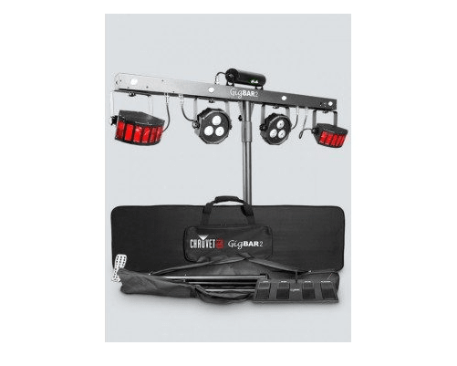 GigBAR 2 is the ultimate pack-n-go 4-in-1 lighting system including UV in its wash lights and strobes for better color mixing and effects. GigBAR 2 includes two LED Derby fixtures, LED wash lights, a laser, and 4 high-power, LED strobe lights all mounted on one bar. The unit features phenomenal built-in automated and sound-activated programs including all 4 effects. You can easily control the unit from the display, IRC-6 remote control, wireless foot switch or DMX to take your gig to a higher level. Master/slave multiple units and save time running cables and extension cords by power linking multiple units. Get in and get out quickly with the included tripod, wireless footswitch and FREE carry bags.