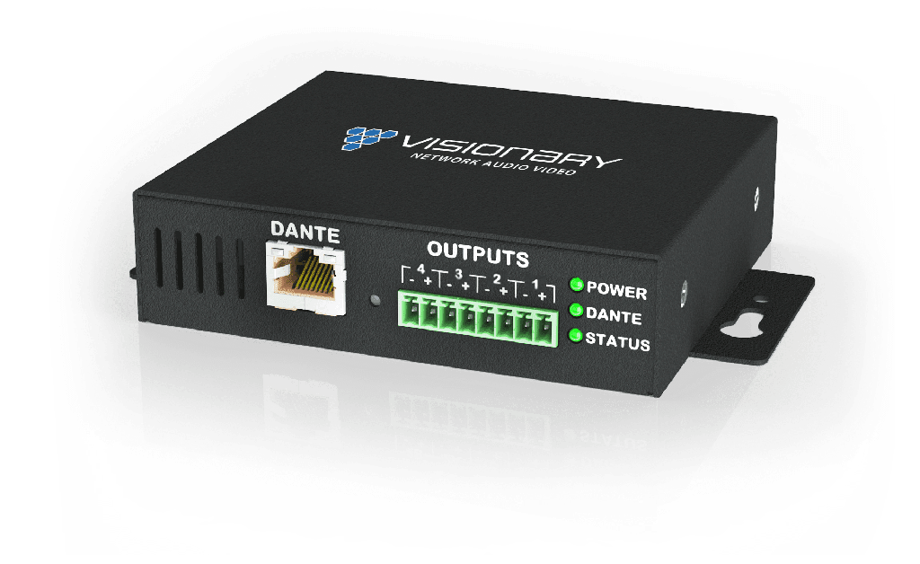 PNA-D4 is the latest product in Visionary’s new PacketAV™ line of network AV endpoints. It is a (4/8 ohms) per channel network amplifier with Dante™/AES67 input that is powered via POE+, no external power supply required. It is a robust unit suitable for industrial, commercial and Pro AV installations. The unit is inherently a network device allowing it to deploy easily and enable precise control of your sound. Four independent channels can be sourced using any Dante™ /AES67 audio on the network using Dante™ Controller software or other third party software. This unit is Class D to allow for efficient use of power.