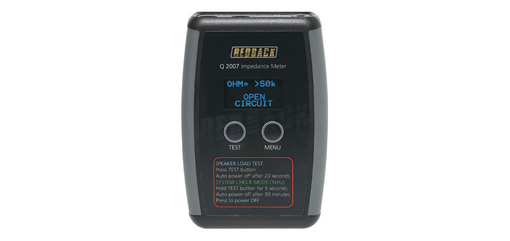 The Redback impedance meter is an absolute necessity for all PA system installers. An impedance meter is critical for accurately measuring low impedance loudspeaker systems, incorporating multiple speakers and crossovers, and for measuring commercial 70V or 100V line speaker systems, which may include many speakers with line transformers and several hundred meters of cable. Trying to measure this type of load is virtually impossible with a standard multimeter. The Redback® Q 2007 measures and calculates loads for both 100V and 70V line systems up to 5k Watts in power. Most impedance meters on the market display the impedance in ohms, leaving the installer to calculate the system wattage. This impedance meter for ‘dummies’ designed and manufactured by Redback calculates and displays speaker loads in watts.An inbuilt system check mode produces a 1KHz test tone into the connected speaker line, enabling the operator to check all speakers on the line are working.