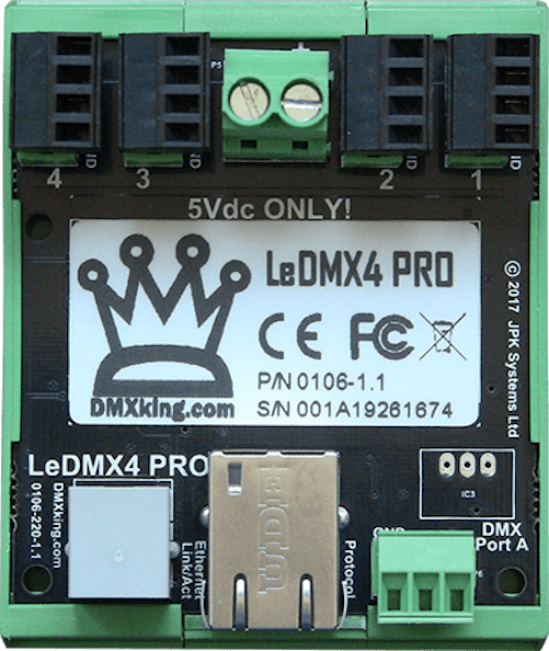 An OEM Board for direct sACN/E1.31 and Art-Net to RGB/RGBW pixel strip/array control. No longer do you need sACN/Art-Net -> DMX512 -> Pixel driver. Eliminate the DMX512 conversion using our LeDMX4 PRO and go direct sACN/Art-Net -> Pixel. Compact and feature packed you’ll find it easy to design into your applications with the ability to scale as big as you like whilst keeping everything synchronized. Designed and manufactured in New Zealand to the highest standards LeDMX4 PRO is a professional product you can rely on backed by our world renowned after sales support.