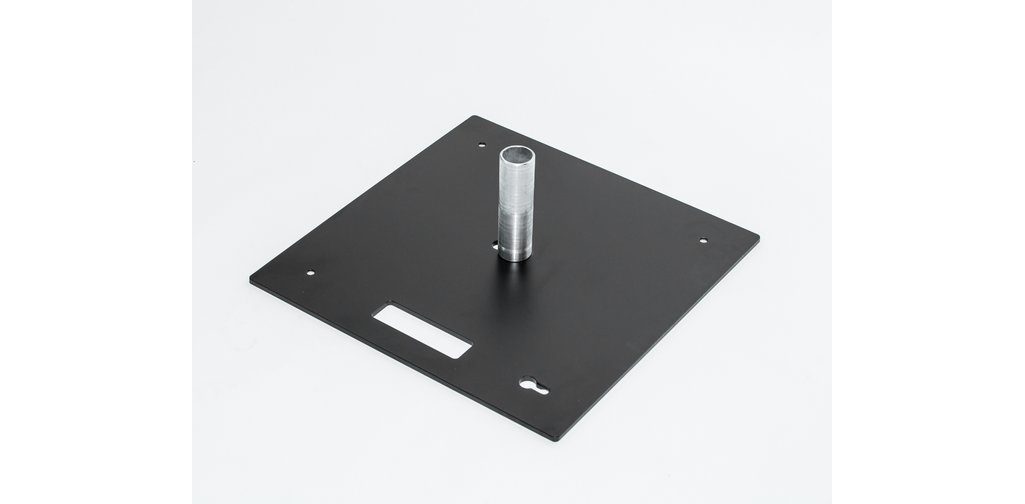 Drape Base & Spigot Pushup 4500 Colour Black powder-coating finish Material Mild steel Bolting (M10) 4 corner holes for bolting to spreader boards SLOT-LOCKs 1 corner and 1 centre SLOT-LOCK holes Spigot 1 included + counter-sunk bolt – 150mm length Shipping Volume 0.003cbm Weight 15kg D x W x H 500 x 500 x 8mm