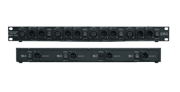 The EWI MST412 is a rugged and reliable 4-channel microphone splitter housed in a standard 1U 19-inch rack format. Each channel features one XLR input and three isolated XLR outputs—one direct and two transformer-isolated—allowing you to send a single mic signal to front-of-house, monitors, and recording simultaneously without signal degradation or ground loop issues.