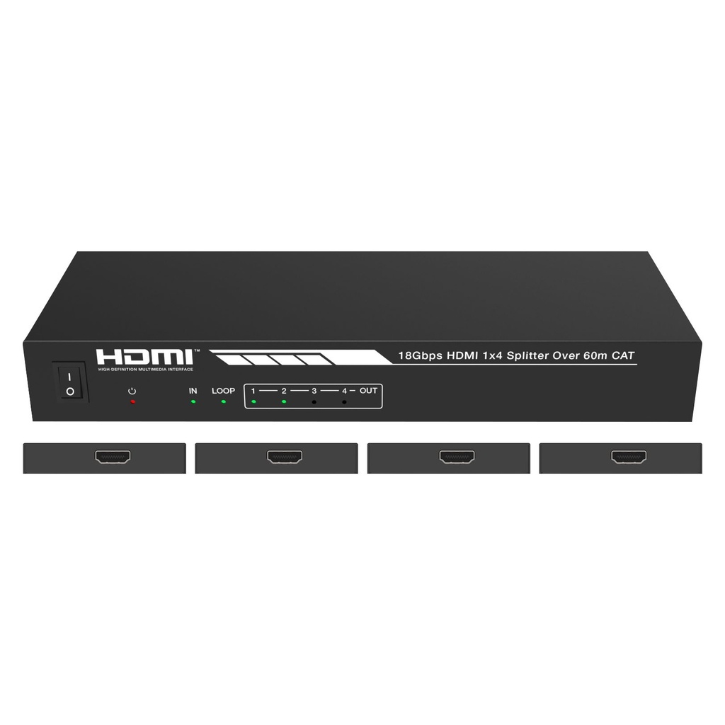 HDMI 2.0 Extender Splitter with 1x HDMI input, 1x HDMI output and 4 x CAT5/6 extended outputs with IR control and POC