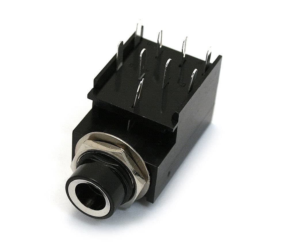 Fender Style replacement ¼” stereo input jack that has 9 PCB mount terminals.