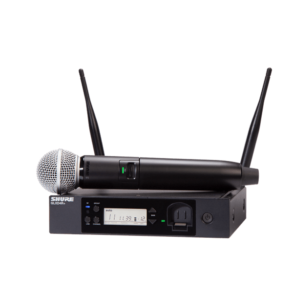 Featuring the industry standard SM58® vocal microphone, the new half-rack GLXD24+/SM58 Dual Band Vocal System delivers superior, transparent digital audio. The perfect combination of the automatic frequency management with the new Dual Band Technology provides reliable and consistent performance while Shure proprietary Lithium-Ion rechargeable batteries provide up to 12 hours of use. Go wireless without complication.