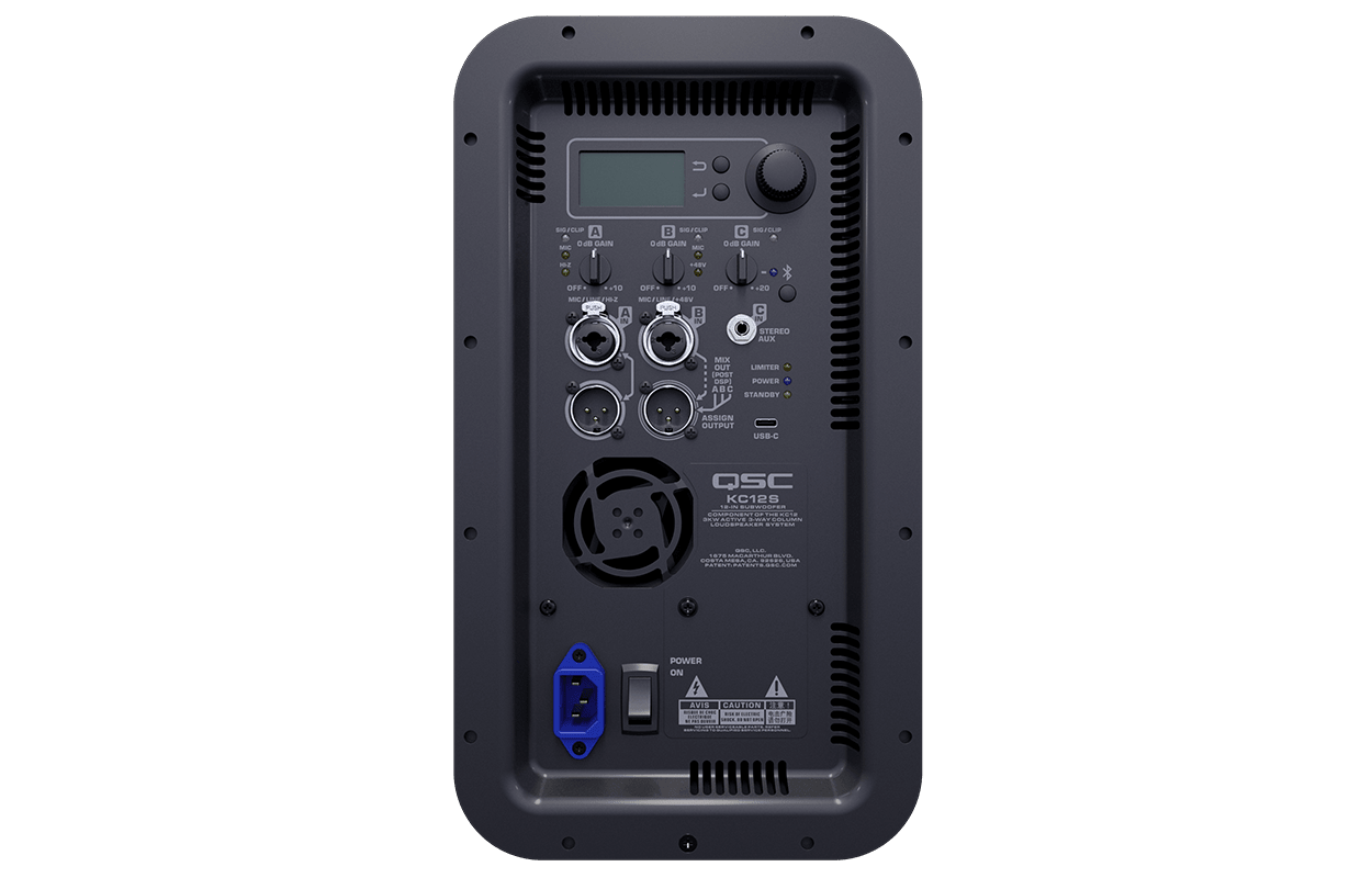 ​The highly portable KC12 system consists of a ported subwoofer, housing a 12-inch driver extending down to 40 Hz. The groundbreaking design of the mid/high enclosure features a 1-inch compression driver combined with the innovative QSC LEAF™ (Length-Equalized Acoustic Flare) waveguide, as well as two high-excursion 4-inch midrange drivers. Thanks to this 3-way design, the system provides an outstanding full-range horizontal coverage of 145 degree, and 35 degrees of audience-directed vertical coverage, with clean and natural sound at all output levels.​