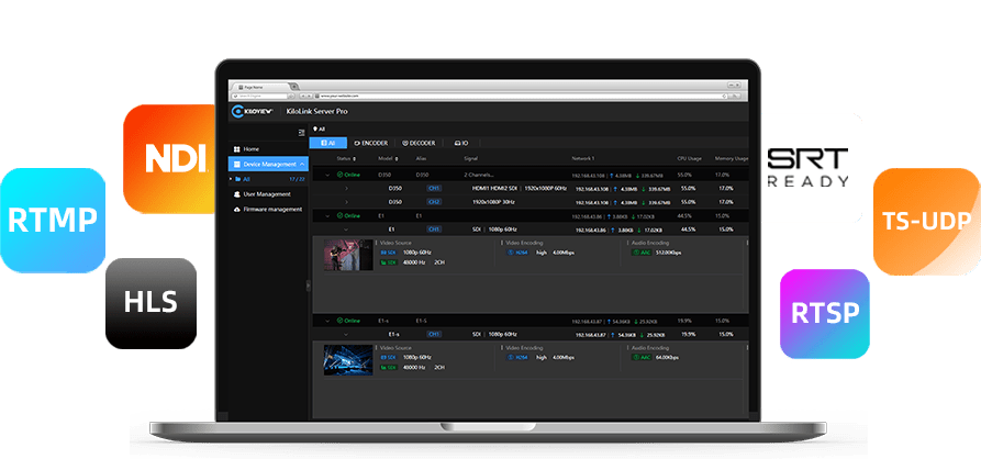 The enhanced KiloLink Server Pro provides management of unlimited number of devices. No matter how many devices or video sources are processed, you can easily register them to your software platform. Now, you can easily manage device status/ remote configuration/ model page switching, firmware upgrade, and more.