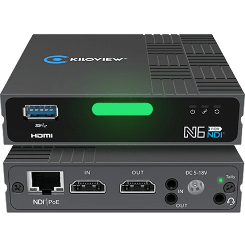 Kiloview N6 HDMI/NDI converter is a bi-directional converter that supports HDMI input (encoder) to both NDI high bandwidth and NDI|HX2/3 with loop through for view on the monitor, or HDMI video output (decoder) from any NDI sources coming from any camera, software or device from any brand, either from NDI high bandwidth or NDI|HX2/3.