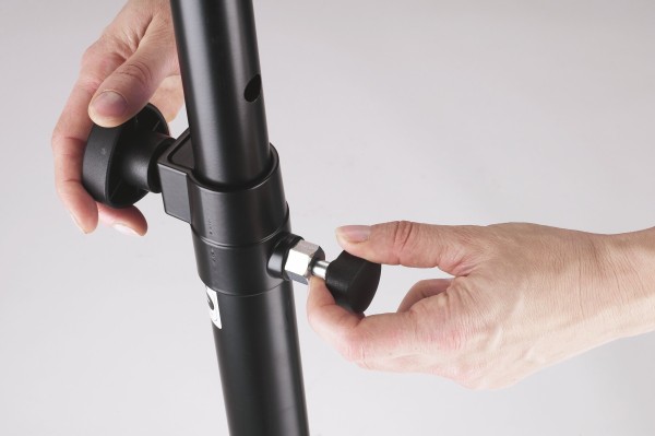 Steel tube combination to connect satellite systems. With bottom M20 thread to attach connector plate 24116. Zero backlash and absolute vertical position. Height adjustment with spring-loaded locking screw and safety bolt.