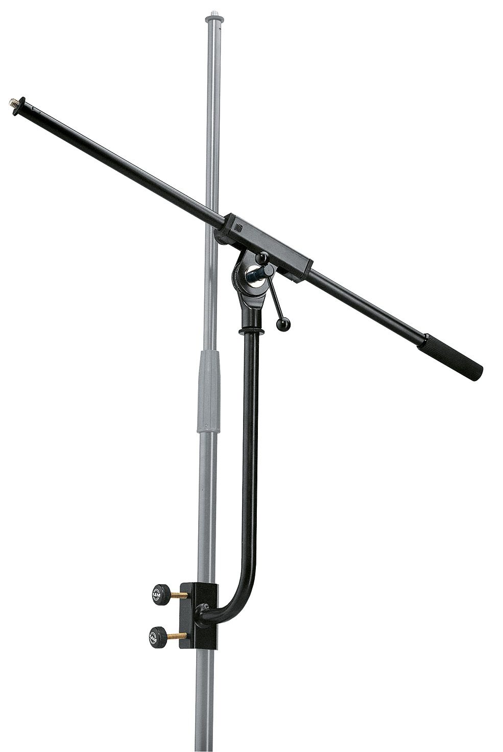 Attaches to stands with diameter from 15 to 30 mm. With prismatic clamp connector. Comes complete with adjustable and swiveling boom arm with 3/8″ thread.