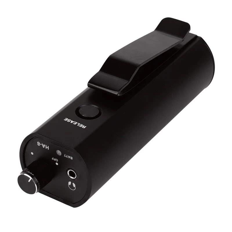 HA-8 is an active converter, belt-pack for personal monitor application. Its built-in battery helps HA-8 to performance. XLR or 1/4’’ make plugs connection of a personal monitor mix. VOLUME knob adjusts the output level and powers the unit off when turned counterclockwise. The adjacent green LED will lit when the power is on. The MONO/STEREO switch should be set to MONO when used with a mixer’s aux send or any other mono source and set to STEREO when connected to a headphone output or other stereo source.