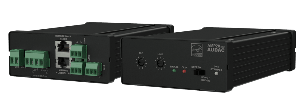 The AMP20 is a mini stereo power amplifier with a power rating of 2 x 15 Watt, that lends itself perfectly to small speaker systems requiring compact and economical audio solutions. It offers the ideal solution for applications such as class rooms, offices and meeting rooms where only a small amount of speakers are required. The compact size and very high efficiency makes it perfectly suited to be hidden in a closet, on a false ceiling or mounted under a desk or table. The combination of the stereo balanced line, with microphone input, makes it perfectly suited for applications where it should be used in combination with projection screens and video sources while a microphone is connected. Two gain potentiometers make it possible to control the sensitivity and balance between music and speech, while a switch allows bridging of the output channels to obtain one channel with merged output power. A remote wall mixer can be connected for applications where local mixing for the inputs is desirable, while large distances can be covered between the source and amplifier using simple CAT5 twisted pair cabling. The volume controller input allows connection of an additional wall controller for overall volume control. The Class-D amplifier technology, standby mode and included switching power supply makes this device compliant to the highest energy efficiency and environmental requirements. A variety of optionally available mounting brackets for the AUDAC S-Box product range are allowing desk, closet or 19” equipment rack installation.