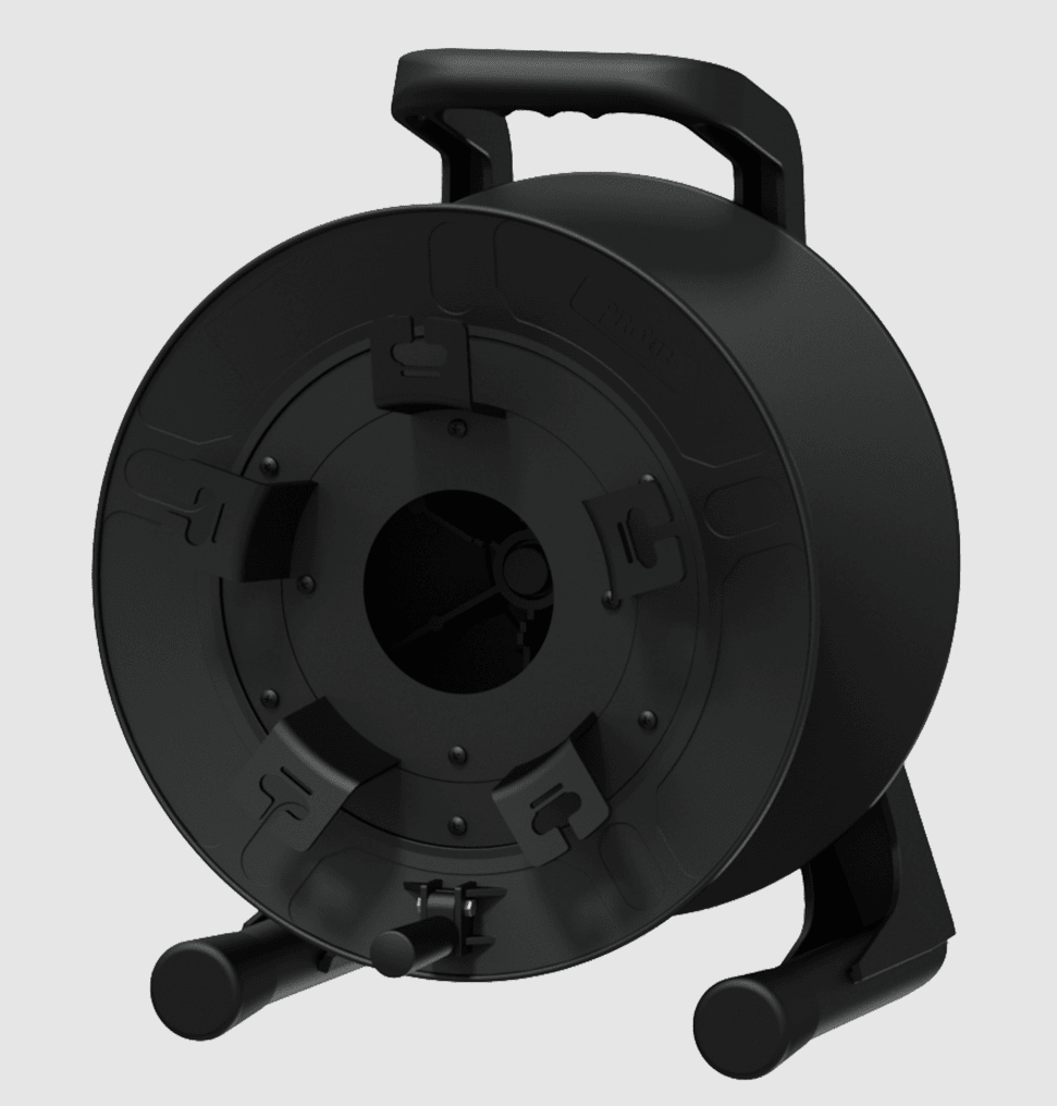 The CDM380 is a cable reel designed for intensive and professional use constructed using lightweight, extremely strong and impact resistant materials. The frame construction is made of polycarbonate (PC) materials while the drum is made of impact resistant polyethylene (PE). The lightweight construction in combination with the ergonomic grip allows easy carriage for mobile applications. The front side is fitted with an external cable winder allowing easy and clean winding of a patch tail, which can be replaced by a variation of optional center plates with different connector cutouts. (depending on the application). The drum dimension of Ø380 mm allows winding of a standard microphone cable (Ø6.5mm) up to 300 meters.