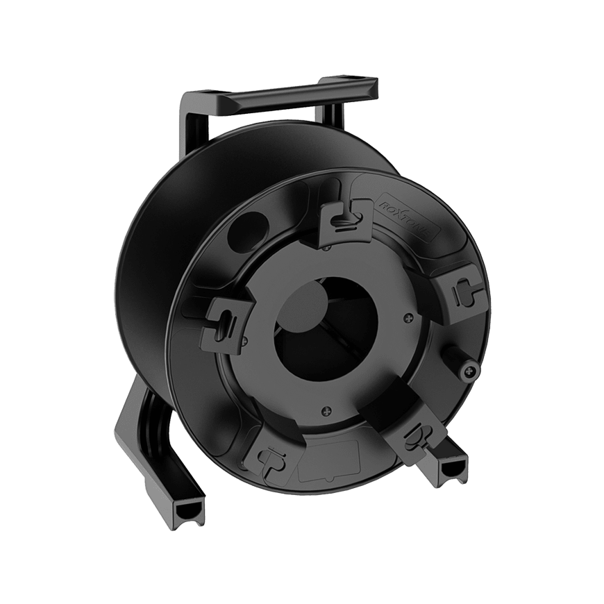 The CDM310 is a cable reel designed for intensive and professional use constructed using lightweight, extremely strong and impact resistant materials. The frame construction is made of polycarbonate (PC) materials while the drum is made by impact resistant polyethylene (PE). The lightweight construction in combination with the ergonomic grip allows easy carriage for mobile applications. The front side is fitted with an external cable winder allowing easy and clean winding of a patch tail, which can be replaced by a variation of optional center plates with different connector cutouts (depending of the application). The drum dimension of Ø 312 mm allows winding of a standard microphone cable (Ø6.5mm) up to 140 meters.