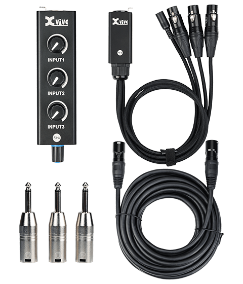 The PX-A Mixer receives audio from a mixing console via the PX-B 3-Channel Snake. The snake’s three XLR plugs (or included XLR-to-1/4” TS adapters) connect to outputs (typically aux outputs) from the console, or other audio sources such as a drum machine or audio interface. Then the included 25-foot EC25 Cat 5 Cable sends the audio to the input of your PX Mixer.