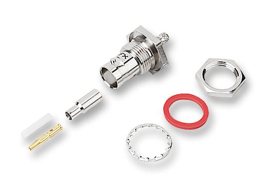 The B6421E1-ND3G-5-50 is a straight bulkhead Crimp BNC Jack with gold-plated phosphor bronze contacts, nickel-plated brass body and a Delrin insulator. The 50Ω BNC product line is a miniature quick connect/disconnect RF connector. It is ideally suited for RG174, RG188A and RG316 coaxial cable.