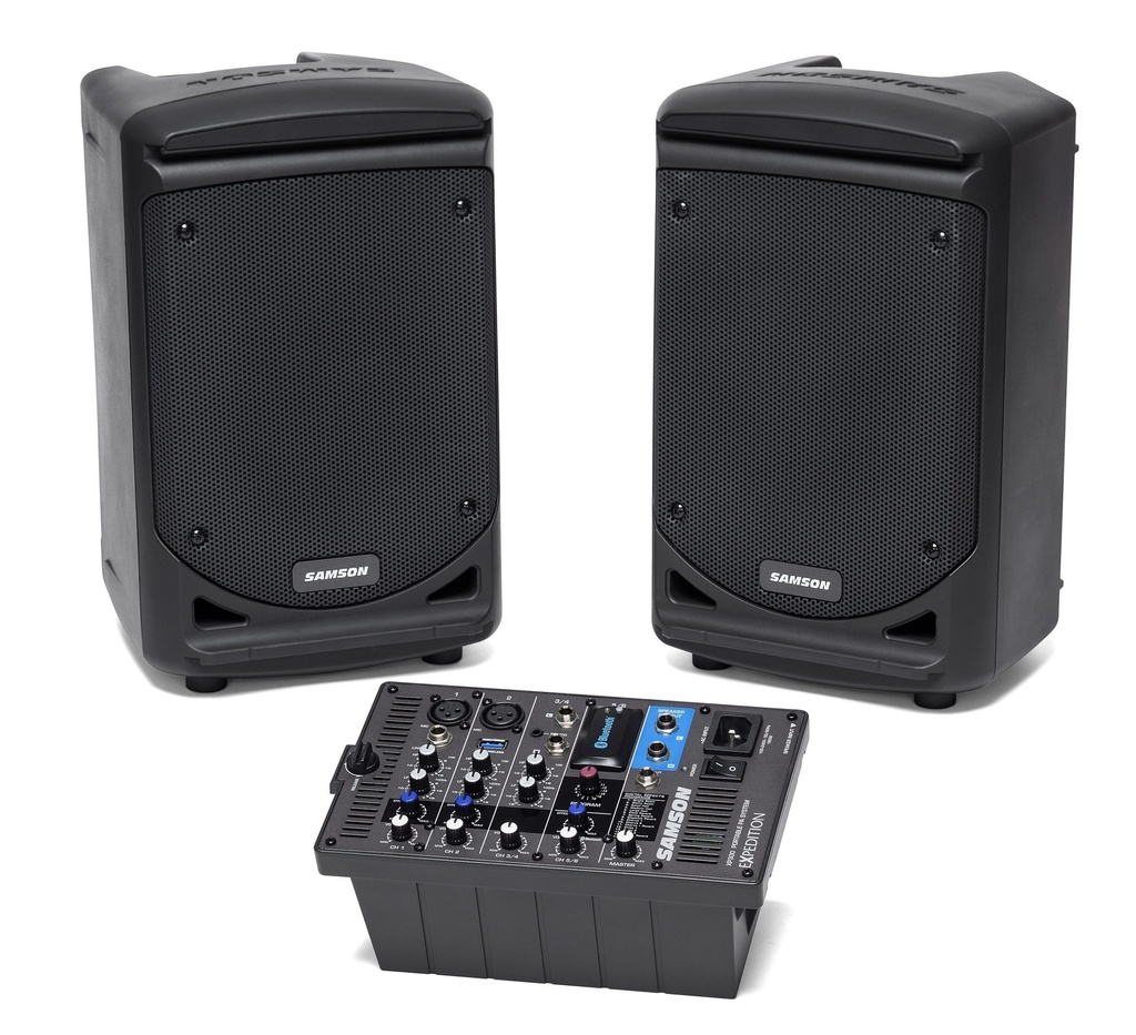 The XP300 speaker enclosures feature 1 3/8″ speaker stands mounts, as well as a tilt-back design that allows them to be used as stage monitors. The mixer section can be removed and mounted on any standard mic stand using the Samson SMS308 Mixer Stand Holder (sold separately). Lastly, two 10′ speaker cables are included with the system.