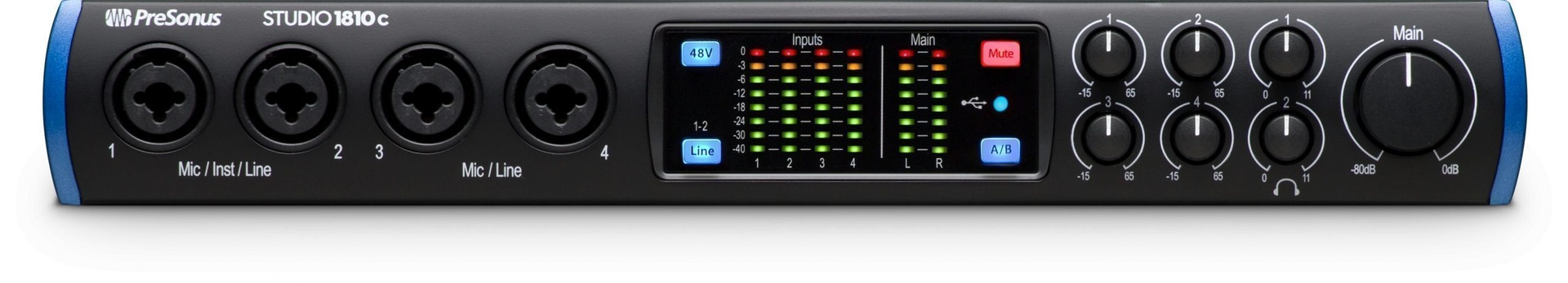 The Studio 1810c operates at up to 192 kHz for ultra-high-definition recording and mixing. High-quality converters on every input and output and four of PreSonus’ professional-grade XMAX mic preamps enable you to capture complex musical harmonics smoothly and naturally, with no audible distortion. XMAX mic preamps are known the world over for their ability to deliver incredibly high headroom, deep lows, smooth highs, and a rich overall sound so you’ll hear every breath, transient, and detail in your recordings.