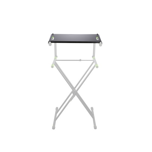 This steel shelf is designed to be placed on second tier keyboard stand add-ons providing a flat surface for tabletop synthesizers, laptops, controllers, drum machines, effect pedals and more. It features a front lip to prevent items from falling off while two convenient 3/8″ screws in the rear corners allow you to mount microphone clips, goosenecks or boom arms. The utility shelf’s left and right edges are bent down 90° adding rigidity, and two handle cutouts provide easy portability.