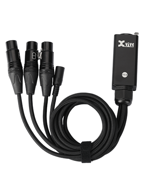 The PX-A Mixer can be powered by two AAA batteries—or, more reliably, a 9V / 2A center-negative power supply connected to the PX-B Snake (we recommend the Xvive A2 Power Supply). The ethernet cable, which can be up to 200 feet long, conveys both the audio from the console and the PoE (Power over Ethernet) from the power supply!